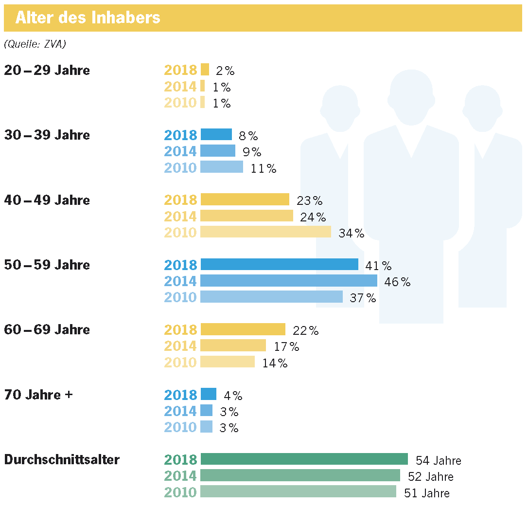 Grafik 1: Der demografische Wandel zeigt sich auch in der Alterspyramide der Inhaber (Quelle: ZVA, 2019)