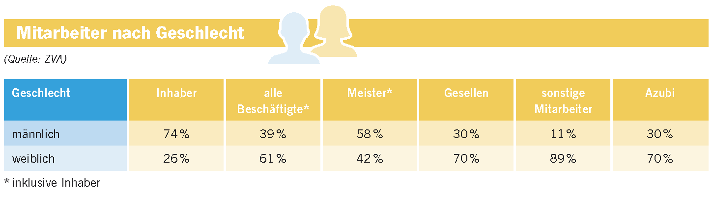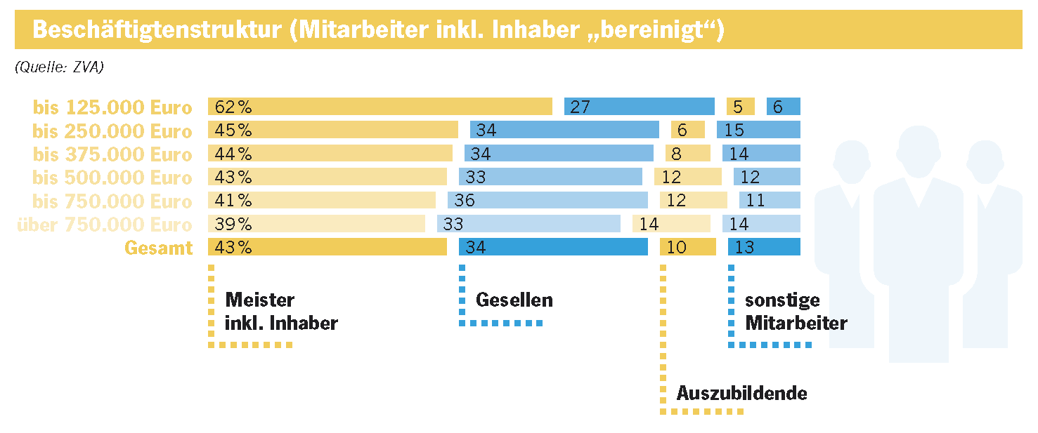 Im Vergleich zur Branchenstrukturerhebung vom 31. Dezember 2014 steigt der Anteil der Meister insgesamt um vier Prozent auf 43 (39)%, der Anteil der Gesellen sinkt im gleichen Zeitraum im Schnitt um fünf Prozentpunkte. Fachgeschäfte mit einem Jahresumsatz über 375.000 Euro pro Jahr haben einen Azubi-Anteil zwischen elf und 14 Prozent. In den größeren Betrieben scheint man verstanden zu haben, dass es von Vorteil ist, die allseits gesuchten Mitarbeiter direkt selbst auszubilden, um sie möglichst an den Betrieb zu binden.