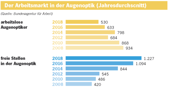 Grafik 4: das Verhältnis zu offenen Stellen im Vergleich zu arbeitslos gemeldeten Augenoptikern geht weiter auseinander (Quelle: Bundeagentur für Arbeit, 2019)