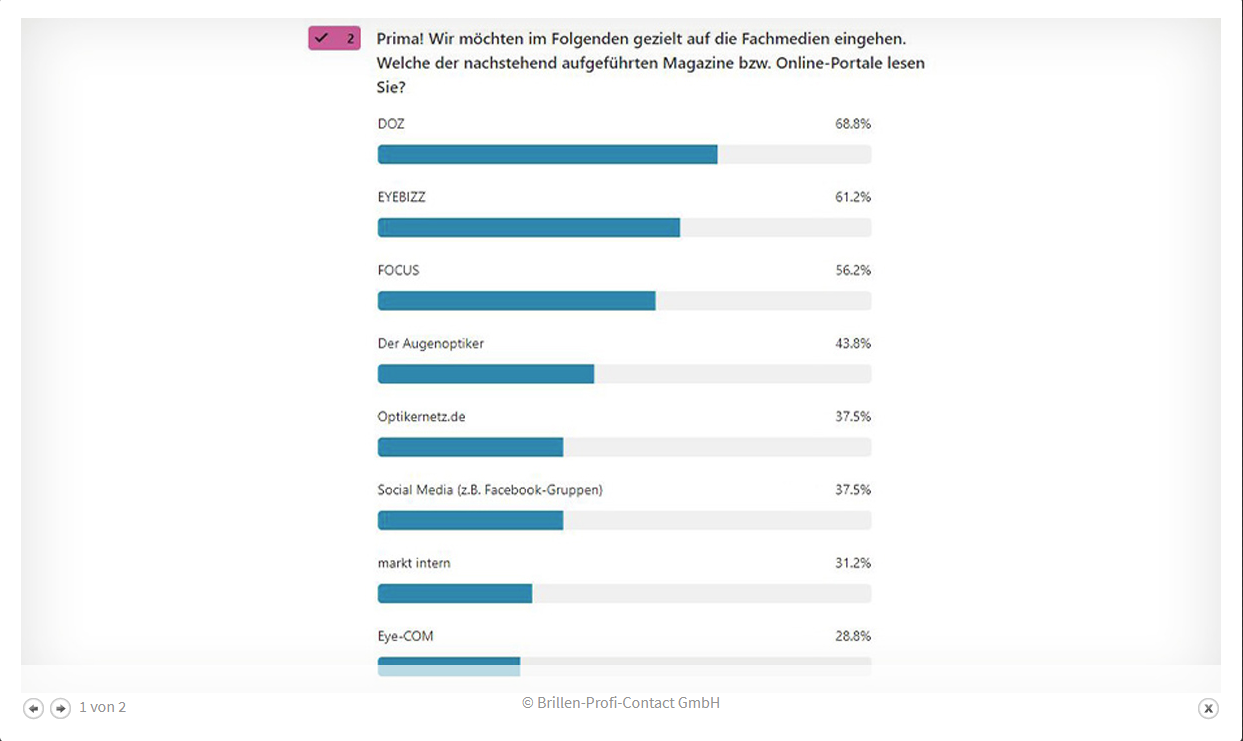 Wie werden Fachmedien von den 1.850 Brillen-Profi-Contact GmbH  Mitgliedsbetrieben genutzt? Das wollte die größte Einkaufsgemeinschaft in Deutschland unter anderem in einer großen Umfrage zu ihrem 30-jährigen Jubiläum wissen. Ein Drittel habe geantwortet und auch die eyebizz in ihrer Arbeit bestätigt: Trotz nur halb so viel Magazinen jährlich liegt eyebizz im Ergebnis mit lediglich 7,6 % weniger auf Platz 2 für die Mitglieder von Brillen-Profi-Contact.