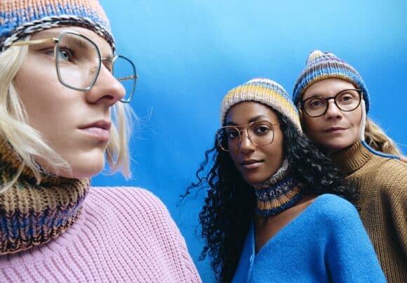 Jede der Fassungen hat einen Innenring, sozusagen einen eigenen Ringel, der der Brille einen völlig neuen Look verleiht. Der Ringellook in farblich passendem Garn „Cool Wool“ setzt sich auf den Strickstücken fort. Aus dem achtteiligen DIY-Wollset entstehen entweder ein angesagtes Balaklava oder ein Mütze-Schal-Ensemble, ein Brillenetui und – für weniger erfahrene Stricker:innen kann ein Brillenband „gestricklieselt“ werden.