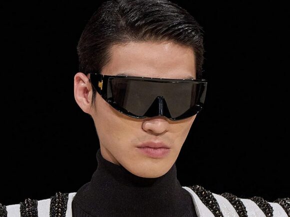 Für den letzten Schliff fügte der Designer die neue Espion von Balmain Eyewear hinzu, eine limitierte Auflage eines übergroßen Wrap-Around-Rahmens, um das zu vermitteln, was Rousteing als „die nötige VIP-Attitüde des Hip-Hop“ bezeichnet.