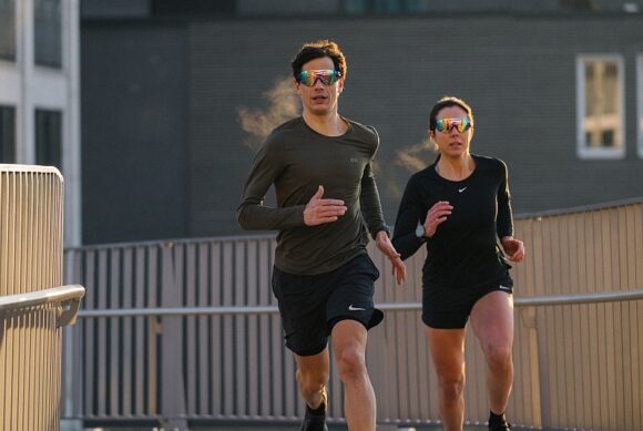 Selbst wenn der Blick der Joggenden nicht direkt zur Sonne geht, können Blendungen von reflektierenden Flächen das Sehvermögen beeinträchtigen. Selbst wer im Alltag keine Korrektionsbrille benötigt, braucht fürs Laufen eigentlich eine Sportbrille.
