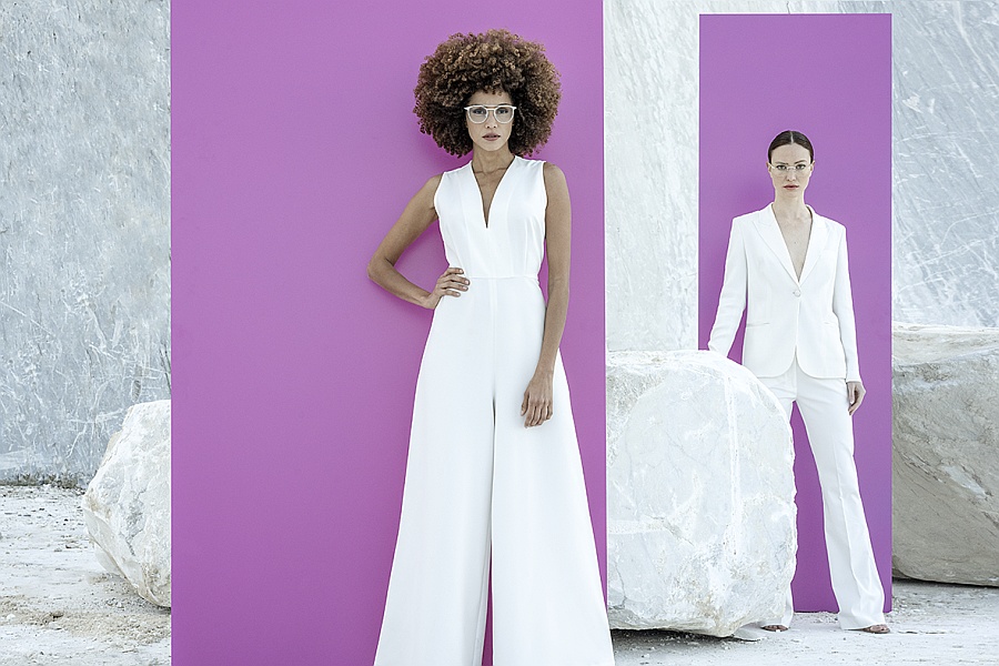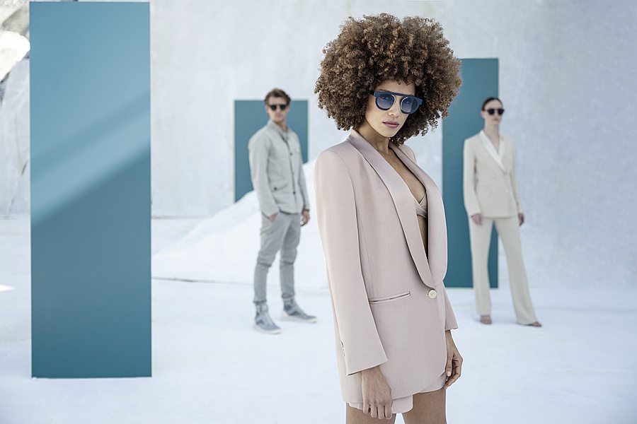 Mit den Aufnahmen des Studio GDS von Giovanni De Sandre unterstreicht die Kampagne den Kontrast zwischen dem makellosen Weiß des Aufnahmeorts, einem Marmor-Steinbruch, und den leuchtenden Farben der Platten, die auf den Aufnahmen zu sehen sind, und die die Farbtöne der Brillen wiedergeben; ein vertrauter und doch unpersönlicher Ort, an dem sich die Modelle elegant und im Einklang mit ihrer Umgebung bewegen.