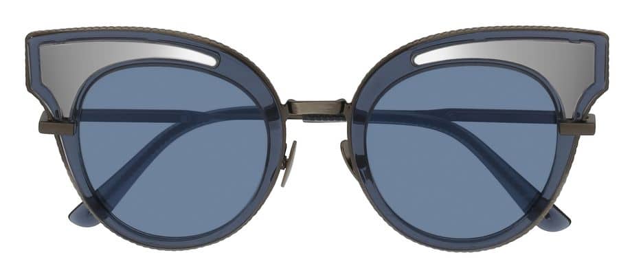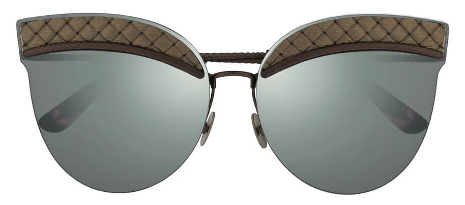 Modell Cylindrical Intrecciato BV0101S: Besonders charakteristisch für diese leichte, filigrane und feminine Sonnenbrille von Bottega Veneta mit Metallrahmen im Cat-Eye-Stil sind die zylindrischen Moneleinsätze zwischen den Gläsern und ein heißgedruckter Grosgrain-Ledereinsatz. Nylongläser.