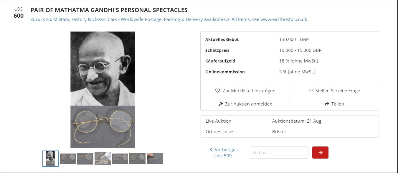Schon vor der Online-Versteigerung am späten Nachmittag des 21. August stieg das Gebot mittags auf 130.000 britische Pfund, selbst für den erfahrenen Auktionator Andrew Stowe eine faustdicke Überraschung, der höchstens mit 50.000 Pfund gerechnet hatte. Es handelte sich um eine der ersten Brillen überhaupt, die der Anführer der indischen Unabhängigkeitsbewegung trug, mit noch wenigen Dioptrien.