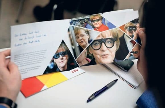 Sieben Wochen vor der Wahl präsentierte die CDU ihre Großplakate und Broschüren. In einem der vorgestellten Flyer zeigt sich die Kanzlerin Angela Merkel mit vielen verschiedenen Brillen.