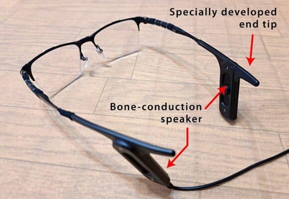 Die Smart Glasses sind mit einem von der TDK Corporation, Chuo-ku (Tokio), hergestellten Piezo-Sound-Demonstrator ausgestattet und enthalten einen Knochenleitungs-Lautsprecher, der von der Onkyo Corporation, Osaka City (Osaka), speziell für Smart Glasses entwickelt und gestaltet wurde.