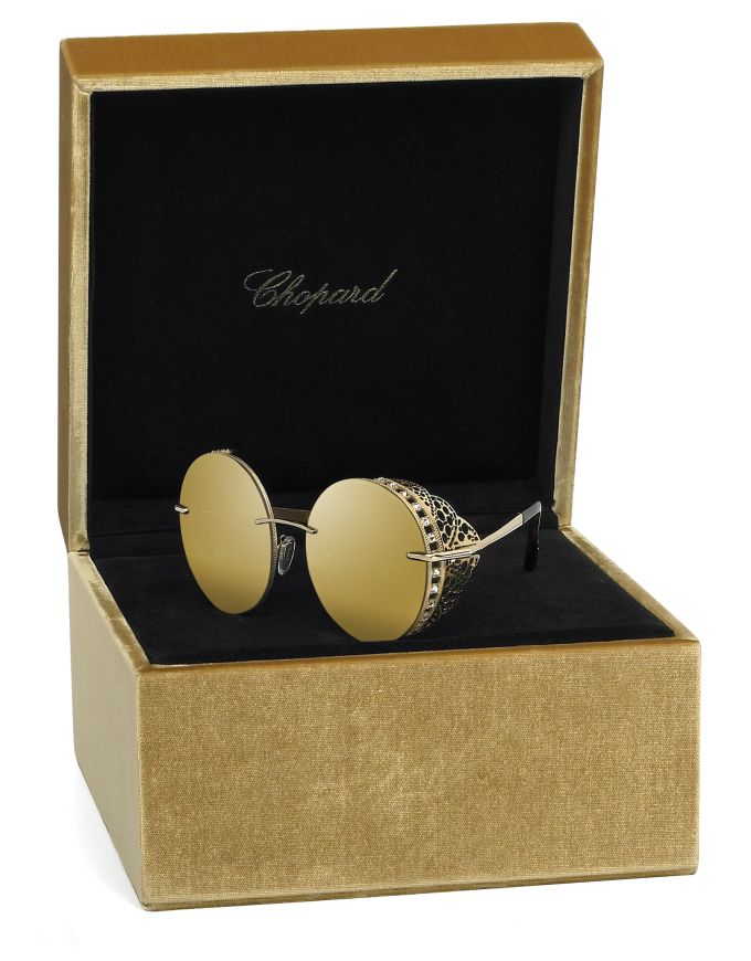 De Rigo bringt zum Filmfestival in Cannes für Chopard eine Special Edition: Das Brillenmodell SCHC68 hat eine runde Front im Oversize-Format. Die in einem 23-karätigen Goldbad beschichtete Fassung besticht durch einen seitlichen „Spoiler“ in Spitzenmuster-Optik, der nach altbewährten Verarbeitungstechniken der Goldschmiede- und Uhrmacherkunst von wahren „Juwelieren der Eyewear“ gefertigt wurde.