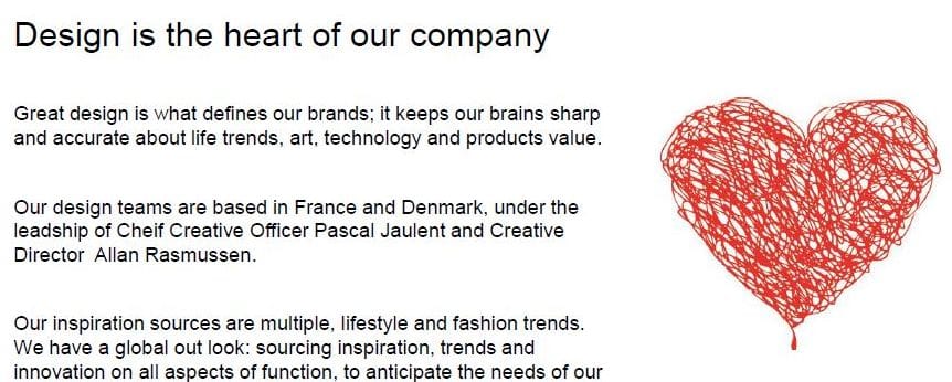 „Wir sind ein Unternehmen mit starken individuellen Designermarken, von denen jede einzelne klar positioniert ist, genau das möchten wir mit unserem neuen Unternehmensnamen ausdrücken“, erklärte Lars Flyvholm, der CEO von Design eyewear group, anlässlich einer Pressekonferenz auf der Silmo 2016. Pascal Jaulent, Art Director der Unternehmensgruppe, ergänzt: „Einige unserer Marken bieten klassisches Design und zeitlosen Stil, während andere eher am Puls der Zeit sind und auf Fun und die neuesten Trends setzen.”