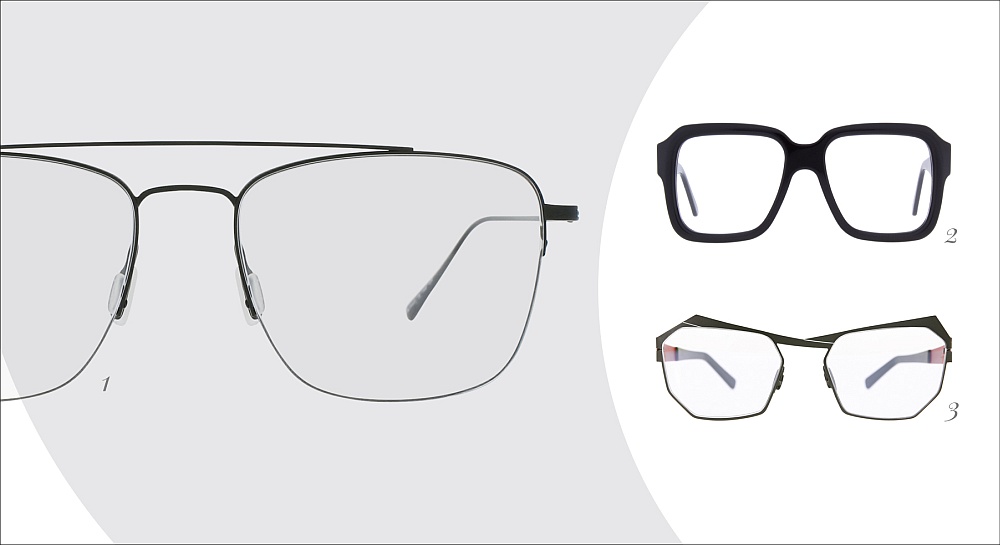 Brillen-Trend 5: Gegensätze für Experimentierfreudige (Modelle: 1 Bogner Eyewear, 2 Silhouette, 3 IC Berlin – Quelle: KGS)
