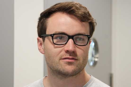 ETH-Doktorand Julian Koch trägt eine Brille, in deren Gläser ein Kurzfilm gespeichert ist. (Bild: ETH Zürich / Jonathan Venetz)