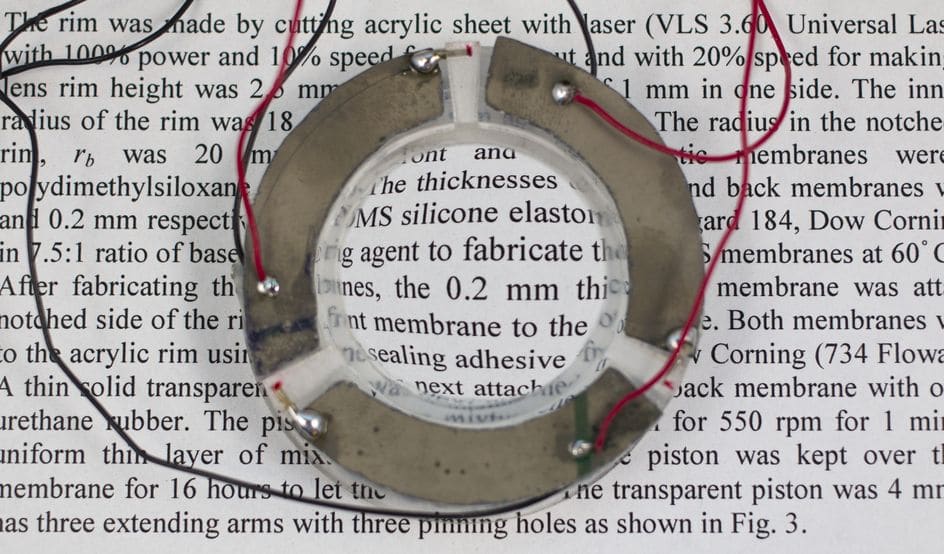 Elektroingenieur Carlos Mastrangelo und sein Team von der University of Utah entwickelten eine “flüssige” Linse aus einer Glycerin-Membrane. Mit Hilfe von drei Servomotoren kann die „Krümmung“ der Linse geändert werden. Ein Infrarotsensor im Brillensteg messe dafür die Distanz zum anvisierten Objekt und gebe diese Info an die Servomotoren weiter. Das Scharfstellen auf ein neues Objekt dauere lediglich 14 Millisekunden.
