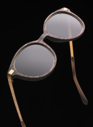 Das Modell kombiniert Eichenholz, Edelstahl, Acetat, Leder und flache CR39-Gläser in einer markanten Retro-Form. Die Whisky-Fass-Konstruktion aus zwei schlanken Metallreifen stabilisiere den handgefertigten Holzrahmen, und für das kunstvolle Finish sorgten feine Gravuren von Edelweiß-Blumen auf dem Steg.