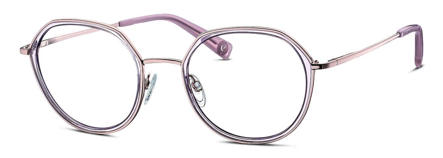 Das Modell von Brendel Eyewear mit geometrischer Akzentuierung an der Oberlinie fällt durch seine aufwendige Zusammensetzung auf. Die Pantoscheibe zeigt transparentes T15-Kunststoffmaterial, das von hochglänzendem Edelstahl eingefasst ist. Die Materialien vereinen sich zu einem Modell, das pure feminine Eleganz ausstrahle. Ein schmales integriertes Federscharnier sorgt für zusätzlichen Tragekomfort.