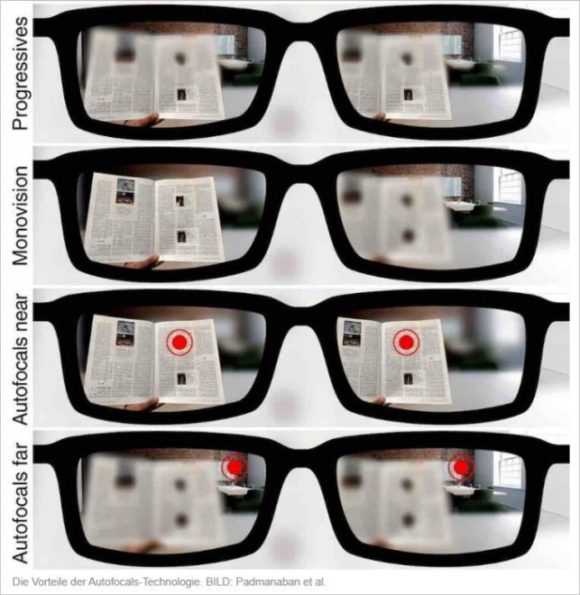 Mittels Eye-Tracking-Software stellen sich die Linsen automatisch scharf auf das anvisierte Objekt und könnten so die fehlende Akkommodation bei Presbyopen ausgleichen, angeblich so einfach wie bei jungen Augen und besser als jedes Brillenglas.