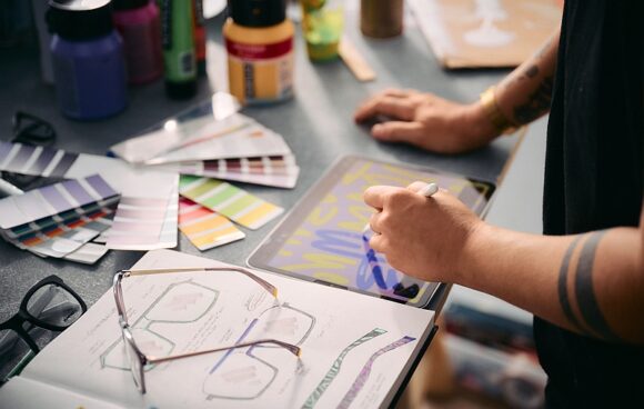 Giulia Wyss beim Design der Brillen für die Capsule Collection von Humphrey’s Eyewear (Bild: Eschenbach Optik)