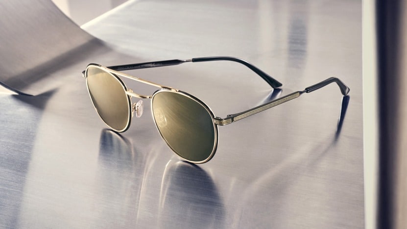 Dieses Modell ist in drei Farbkombinationen erhältlich: Schwarz mit grau polarisierten Gläsern, Schwarz mit Details in Rosé-Gold und bronzefarbenen Gläsern sowie dunkles Schildpatt mit grün verspiegelten Gläsern.