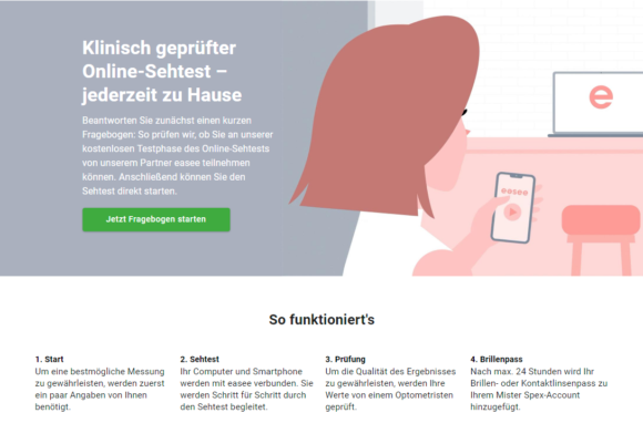 Mister Spex biete ab sofort als erster Optiker Kunden in Deutschland die Möglichkeit eines individuellen Sehtests über eine Online-Anwendung. Der Service ermögliche die Überprüfungen der Sehstärke für kurzsichtige Brillen- und Kontaktlinsenträger mit Refraktionswerten im schwachen bis mittleren Einstärkenbereich. Kunden mit entsprechenden Werten könnten mit dem Online-Service ihre aktuellen Sehwerte kostenlos von zu Hause aus selbst überprüfen. Der von Mister Spex angebotene Online-Sehtest wurde vom TÜV1– und CE2-zertifizierten Software-Unternehmen easee aus den Niederlanden entwickelt und am Medizinischen Zentrum Utrecht klinisch getestet3. Über die nächsten Monate sammle Mister Spex zusätzliches Feedback und Erfahrungen seiner Kunden zu dem Test, die dann in die Weiterentwicklung einfließen sollen. Der Test kostet 19 €, die bei einer Bestellung gutgeschrieben werden.