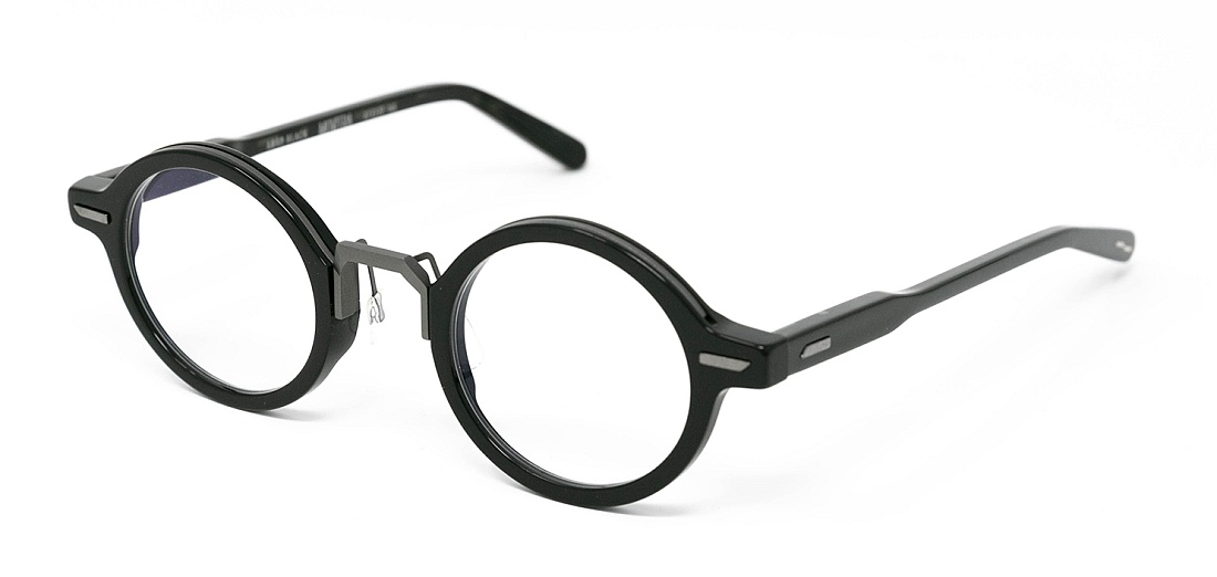 Argo – eines von zwei Kombinationsmodellen in der neuen optischen Kollektion: eine runde Augenform aus Acetat und Nasensteg aus Metall mit kontrastierendem geometrischem Design (Bild: Movitra)