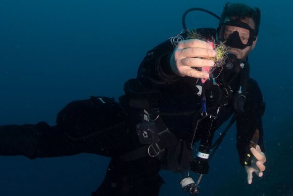 Die Kollektion Eco Ocean von Modo Eyewear wird in Zusammenarbeit mit Waste Free Ocean, einer Partnerorganisation der UN, aus recyceltem Ozeanplastik hergestellt – hier sammelt ein Taucher bei Baia dei frati in Italien Plastikmüll aus dem Meer (Bild: Modo)