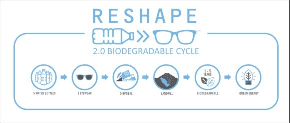 Die Zertifizierung ist das Ergebnis der Entwicklung von Bio-RPET, einem neuen Material, welches das 3R-Ökokonzept (Recyclen, Reduzieren, Rückgewinnen) umsetzt und in „Reshape“, einer Upcycling-Brillenkollektion von Okia aus Hong Kong, die ausschließlich fünf Wasserflaschen zur Herstellung einer Fassung benötigt, Gestalt annimmt.