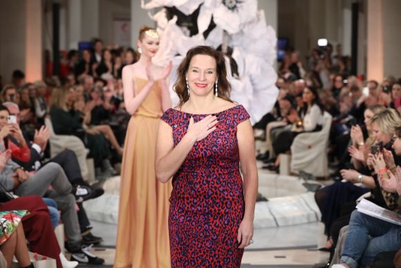 Eine Viertelstunde später geht’s schon los. Anja Gockel stellt das Motto ihrer Winterkollektion persönlich vor: „Théa“ – die Göttin – und appelliert an die modebewusste Frau: „Stellt Eure Weiblichkeit in den Mittelpunkt und findet Euer Gleichgewicht. Seid authentisch und mutig.“ Dann marschieren die Models los.