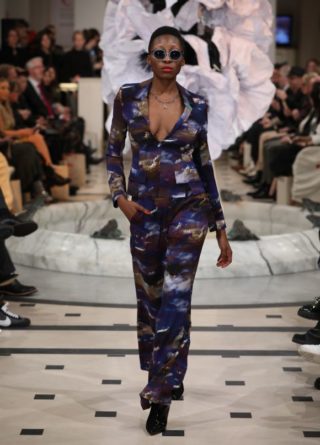 Bei den gezeigten Entwürfen kombiniert Gockel Glitzer-Miniröcke zu lässigen Pullovern und einen Tweed-Mantel zum Federrock. Zu sehen sind viele gedeckte Grün- und Beerentöne, Roben, XXL-Schnitte, fließende Formen, Glitzer und Kaschmir und als echte Eyecatcher immer wieder Brillenfassungen „designed by Hies“ – mal in XXL-Form, mal farblich akzentuiert, mal glitzernd. Gockel lässt auch Frauen laufen, die keine Profi-Models sind, etwa eine Klempnerin und eine Olympionikin. Am Ende dann tosender Applaus und eine sehr glücklich aussehende Designerin im Kreis ihrer Models.