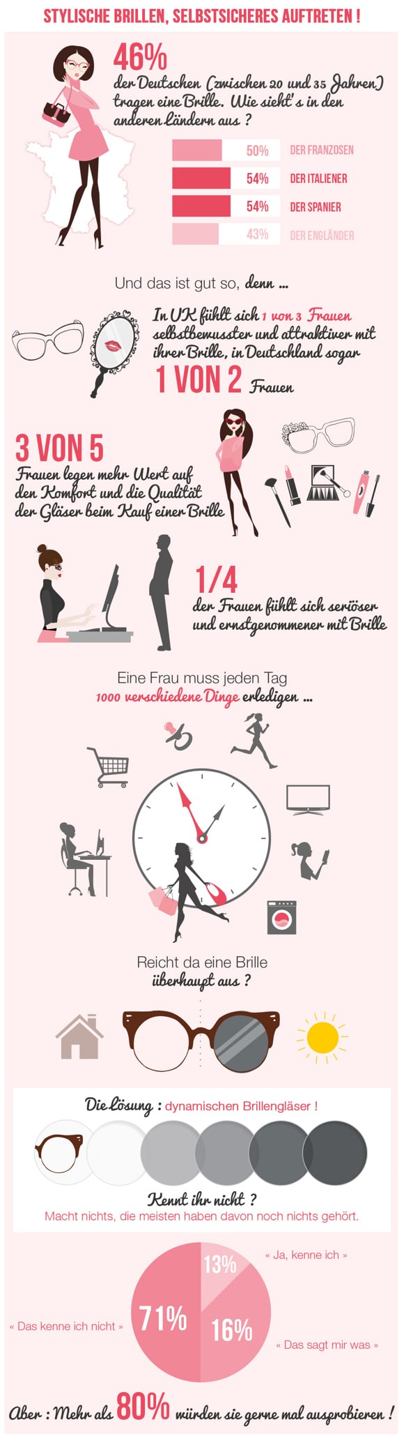 Die weiblichen Ansprüche an eine Brille sind groß. Die Fassungen sollen modisch sein, den persönlichen Stil unterstreichen, das Gesicht perfekt einrahmen. Die Gläser sollen nicht zu dick sein, in alle Richtungen eine perfekte Sicht ermöglichen und die Augen schützen. Dieser Meinungsquerschnitt ergibt sich aus der Umfrage, die von über 5.000 Teilnehmerinnen aus Deutschland, Frankreich, Spanien, Italien und UK beantwortet wurde.