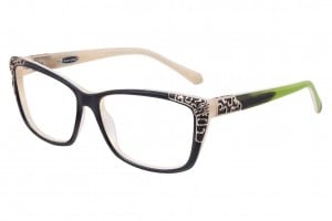Clean Thing, ein rechteckiges Modell dieser Kollektion, fällt auf durch seine extravaganten Farbkombinationen und seinen dekorativen Details. Eine zarte, auf Seide eingebettete Feder ist das Acetat des Brillenrahmens eingearbeitet. In Szene gesetzt wird das Modell durch eine Verzierung mit Halbedelsteinen sowie lackierten Mäanderbändern.