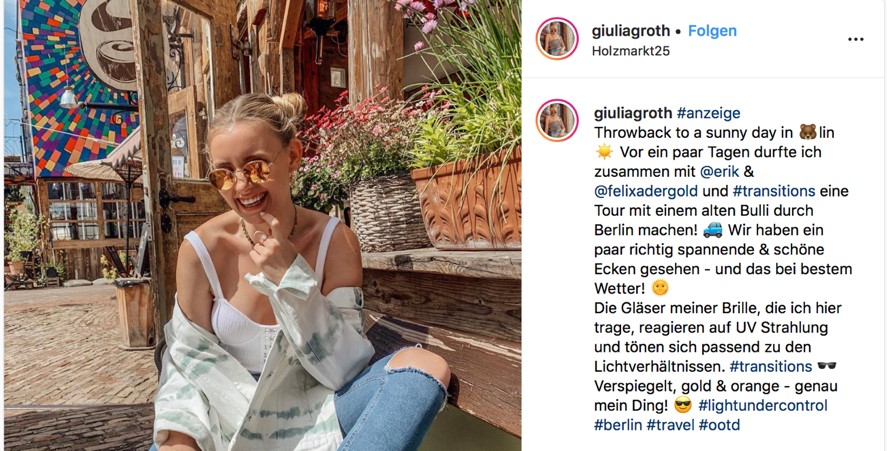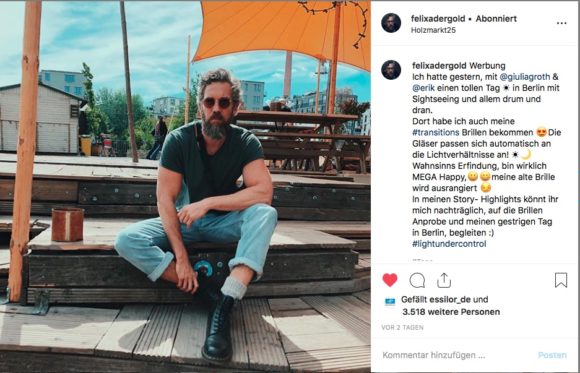 Transitions im Praxis-Test von drei Top-Influencern: Das Ergebnis der Influencer-Aktion kann sich sehen lassen: Weit über 1 Mio. Kontakte, rd. 200.000 Instagram Story-Views und eine Interaktionsrate, die doppelt so hoch ist wie der normale Durchschnitt. Seit März läuft mit großem Erfolg die Transitions® Media-Kampagne Light Under Control und lenkt u.a. mit gezielter Online-Werbung sowie mit ganzseitigen Advertorials im auflagenstarken People- und Lifestylemagazin GALA und im Trendmagazin JWD die Aufmerksamkeit im B-to-C auf die stylishen selbsttönenden Transitions Brillengläser.