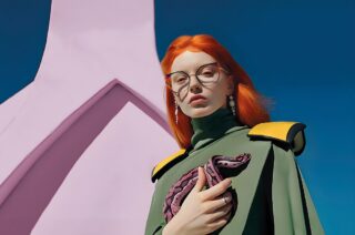 Die Vollrandfassung auf der rechten Seite passt sich perfekt in das Gesicht ein und führt zu einer angenehmen Verkürzung. Unterstützt wird der Effekt durch die etwas betonten Augenbrauen, die in die Stirn fallenden Pony-Fransen und den kleine Stehkragen.