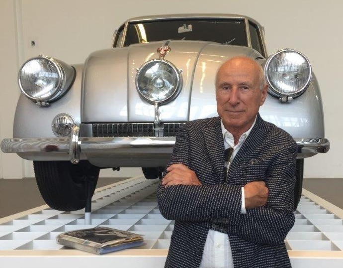 Design trifft auf Design: Robert La Roche beim gemeinsamen Spaziergang durch die Neue Sammlung der Pinakothek der Modernen in München. In so einem schnittigen Tatra 87 (nach dem Entwurf von Hans Ledwinkaist, 1937) ist der branchenbekannte Designer schon als kleiner Junge mit seinem Vater gefahren. Das Bild entstand anlässlich der Vorbereitungen zur opti 2017 auf Einladung der Messegesellschaft GHM Ende Juni `16. Foto: Christine Höckmann