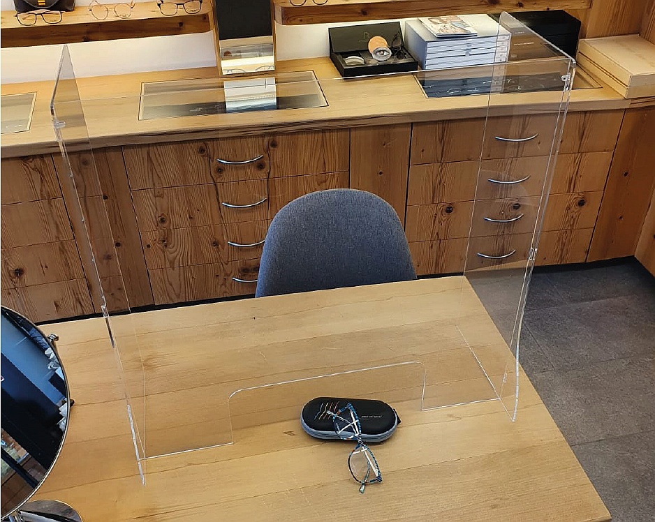 Pomberger bietet einen praktischen, transparenten Gesundheitsschutz aus Acrylglas zur Montage im Augenoptik-Fachgeschäft an. Die standsichere und sehr leicht mobil einsetzbare Trennwand aus Acrylglas eigne sich optimal als Nies-, Spuck- oder Hustenschutz und beuge Tröpfchen-Infektionen vor.
