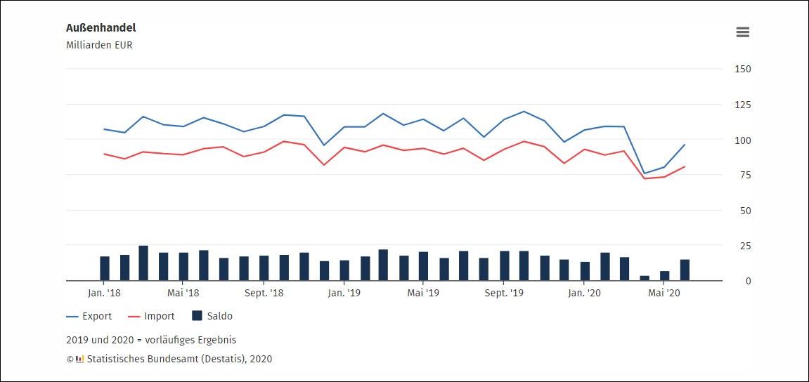 Die Außenhandelsbilanz schloss im Juni 2020 mit einem Überschuss von 15,6 Milliarden Euro ab. Im Juni 2019 hatte der Saldo in der Außenhandelsbilanz noch 16,5 Milliarden Euro betragen. Kalender- und saisonbereinigt lag der Überschuss der Außenhandelsbilanz im Juni 2020 bei 14,5 Milliarden Euro.