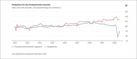 Die Industrieproduktion (Produzierendes Gewerbe ohne Energie und Baugewerbe) ist demnach im Juni 2020 um 11,1% gegenüber Mai 2020 gestiegen. Innerhalb der Industrie nahm die Produktion von Vorleistungsgütern um 5,0% zu. Bei den Konsumgütern stieg die Produktion um 7,3% und bei den Investitionsgütern um 18,3%. Außerhalb der Industrie lag die Energieerzeugung 5,5% höher als im Vormonat. Die Bauproduktion stieg um 1,4%.