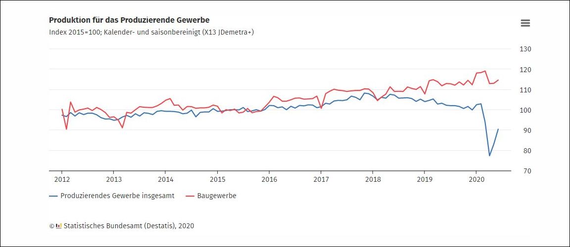 Seit dem Beginn der Corona-Krise ist der Produktionsindex in der deutschen Wirtschaft mehrere Monate in Folge gefallen, seit Mai steigt er wieder. Im Vergleich zu Februar 2020, dem Monat vor dem Beginn der Einschränkungen, liegt die Produktion im Juni 2020 saison- und kalenderbereinigt noch um 12,1% niedriger.
