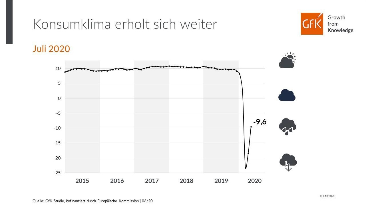 Die zügige Öffnung von Wirtschaft und Gesellschaft in Deutschland lässt Verbraucher den Corona-Schock mehr und mehr vergessen. Sowohl die Konjunktur- und Einkommenserwartung als auch die Anschaffungsneigung legen spürbar zu. GfK prognostiziert in ihrer Konsumklima-Studie für Juli 2020 einen Wert von -9,6 Punkten und damit neun Punkte mehr als im Juni.