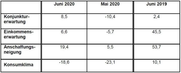 Die Verbraucher erwachen zunehmend aus der Schockstarre, die noch im April zu einem beispiellosen Absturz der Stimmung geführt hatte. Zum zweiten Mal in Folge legt das Konsumklima zu. Damit hat der Indikator seit seinem Tiefpunkt im April dieses Jahres insgesamt mehr als 13 Punkte hinzugewonnen. Allerdings ist ein Wert von -9,6 Zählern der drittniedrigste Wert, der in der Historie des Konsumklimas jemals gemessen wurde.