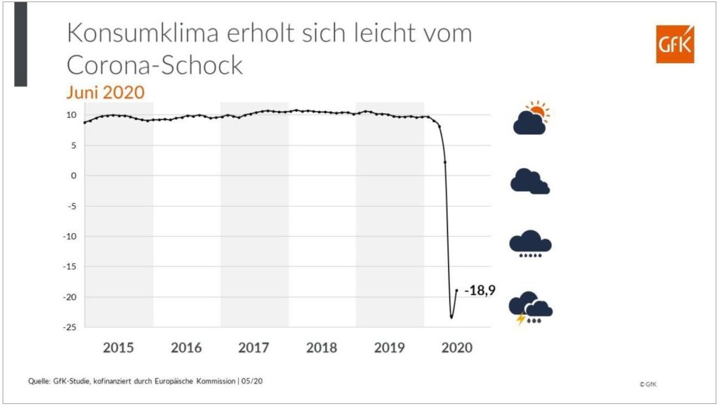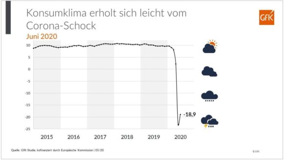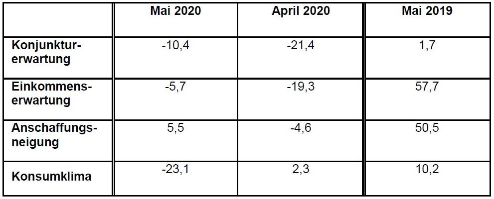 In der April-Erhebung der GfK-Konsumklima-Studie standen sehr viele Verbraucher durch die schrecklichen Bilder aus Norditalien, New York und Spanien unter Schock. Das hatte zu einem beispiellosen Absturz der Konsumstimmung beigetragen. Ein weiterer Fall des Konsumklimas ist im Monat Mai nicht zu beobachten. Dennoch sei ein Wert von -18,9 Punkten der zweitniedrigste Wert, der jemals für das GfK-Konsumklima gemessen wurde, so das Institut.