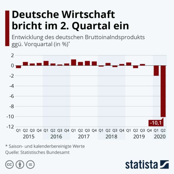 Laut Statistischem Bundesamt (Destatis) ist das Bruttoinlandsprodukt (BIP) im zweiten Quartal 2020 gegenüber dem ersten Quartal 2020 – preis-, saison- und kalenderbereinigt – um 10,1% gesunken, der stärkste Rückgang seit Beginn der vierteljährlichen BIP-Berechnungen für Deutschland im Jahr 1970. Er sei damit deutlich stärker ausgefallen als während der Finanzmarkt- und Wirtschaftskrise (-4,7% im 1. Quartal 2009).