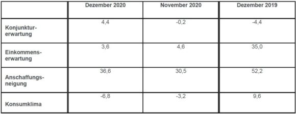 Die folgende Tabelle der GfK zum Konsumklima zeigt die Entwicklung der einzelnen Indikatoren im Dezember im Vergleich zum Vormonat und Vorjahr: