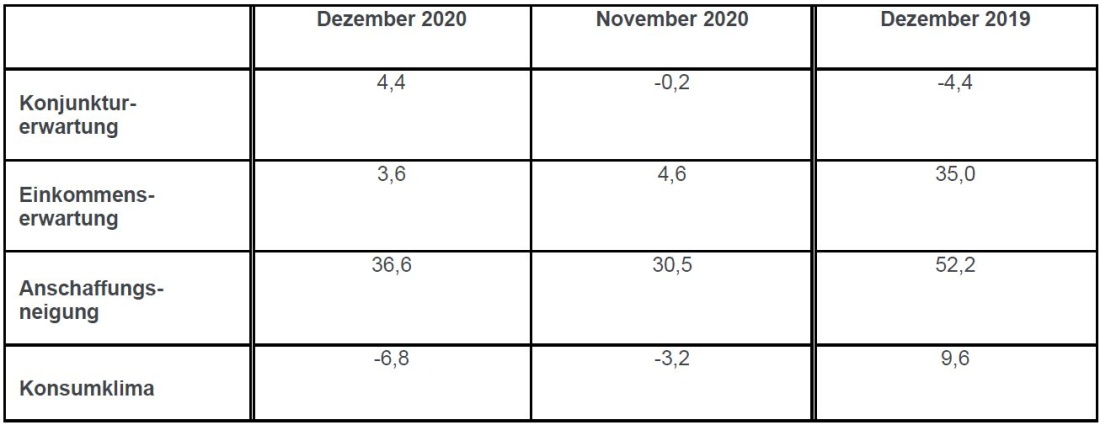 Da die Erhebung zum Konsumklima vom 3. bis 14. Dezember stattfand, konnten mögliche Effekte aus dem harten Lockdown noch keine Berücksichtigung finden. Es sei aber zu befürchten, dass sich eine grundlegende Erholung der Konjunkturstimmung nun weiter verzögert, zumal auch wichtige Handelspartner Deutschlands derzeit ebenfalls von der zweiten Infektionswelle betroffen sind. Vermutlich wird deshalb auch die Export-Entwicklung, die für die deutsche Wirtschaft enorm wichtig sind, eine schwierige Phase haben.