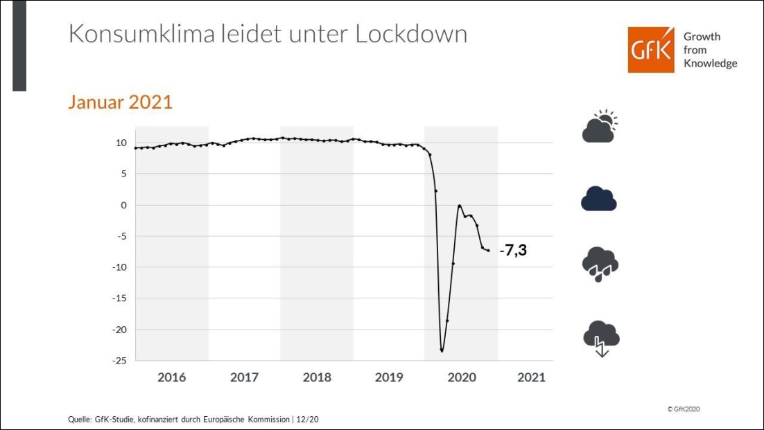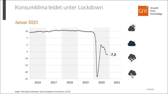 „Es ist zu befürchten, dass auf das Konsumklima in den kommenden Wochen eine sehr schwierige Phase zukommen wird“, erklärt Bürkl. „Eine Entspannung bzw. Erholung kann es sicherlich erst dann geben, wenn die Infektionszahlen so weit gesunken sind, dass die harten Beschränkungen wieder gelockert werden können.“