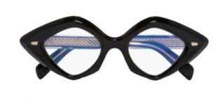 Ein Klassiker, der erstmals von Elton John, einem Kunden von Cutler and Gross, getragen wurde, wurde durch ein modernes Objektiv überarbeitet und es entstand der optische Rahmen 9126. Die exzentrische Silhouette kombiniert eine geschwungene Augenbrauenlinie mit eckigen Seiten und Abschrägungen. Sie ist mit einer Konstruktion aus getrennten Schichten geformt, die das schwarze Acetat mit transparenten Bügelrändern aufhellt. Zu den Designdetails gehören Horizontal Oyster-Frontpins, Scharniere mit 5 Stiften, Compass Star-Bügelpins, ein Hazard-Mittelfaden, ein Logo aus Blattgold im Bügel und minimale Bügelenden.