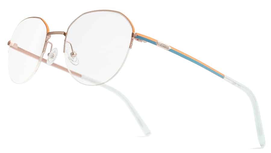Der Fokus bei der Art Couture 9122 liegt auf dem Bügel, der sich aus drei unterschiedlich ineinander verschlungen Elementen zusammensetzt, die miteinander zu spielen scheinen. Die Dreidimensionalität schafft Bewegung, die unterschiedliche Materialität erzeugt Kontrast, wobei die aufwendige Farbgebung der Fassung diesen Effekt unterstreicht.