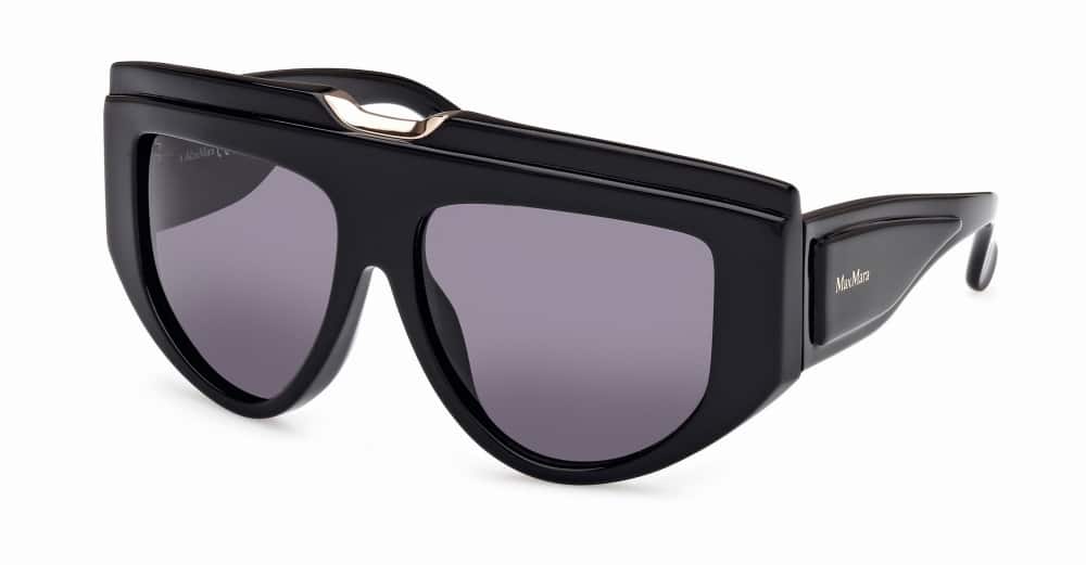 Max Mara Eyewear zeigte eine moderne Fassung, die zur Feier des zehnjährigen Jubiläums des kultigen Teddybär-Mantels der Marke entworfen wurde. Die Bügel verleihen dem Rahmen mit geometrischen Linien Charakter.