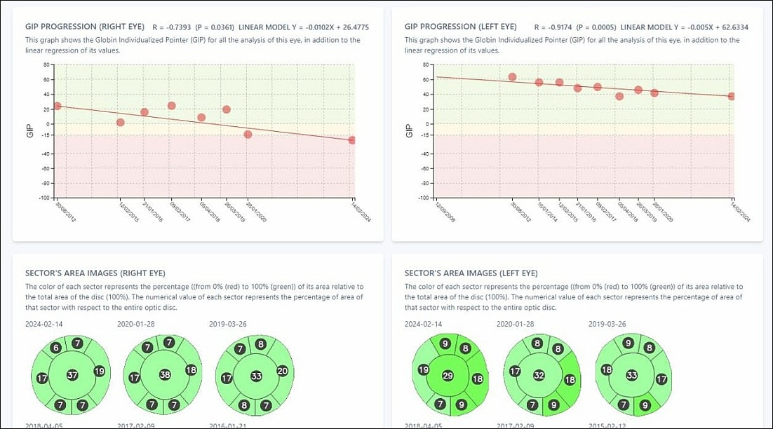 Die Advanced Glaucoma Progression AI funktioniert, indem sie den Fortschritt von Glaukomen über die Zeit überwacht und selbst geringfügige Veränderungen erkennt. Sie nutzt den sogenannten „Glaucoma Index of Progression (GIP)“ zur präzisen Verfolgung der möglichen Erkrankung. Eine besondere Stärke der Technologie liegt in der gleichzeitigen Analyse beider Augen, was Augenoptikern und Optometristen ermöglicht, die Ergebnisse nebeneinander zu betrachten und ein umfassendes Bild der Sehnerv-Gesundheit und der umliegenden Strukturen zu erhalten.