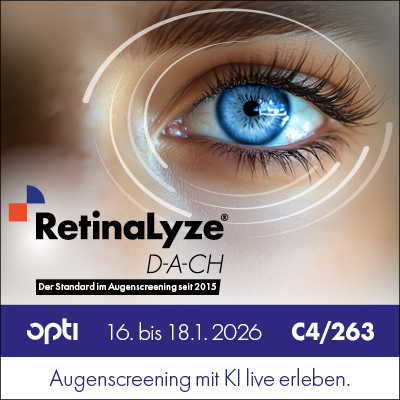 Die RetinaLyze-Software ist ungeachtet der aktuellen Diskussionen rund ums Augenscreening die effiziente und zuverlässige Methode für Augenoptiker. Auf der opti 2026 präsentiert das ORIGINAL der Künstlichen Intelligenz neben einem optimierten PDF-Ergebnisbericht auch die 3D-Visualisierung der Morphologie des Sehnervenkopfes: eine bahnbrechende neue Software-Funktion, die es Augenoptikern und Optometristen ermöglicht, strukturelle, perfusionsbasierte Erkenntnisse zu gewinnen – ohne OCT! Warum RetinaLyze mit seiner KI und dem an die Software angeschlossenen Backup-Augenarzt auch in Zukunft den Augenoptiker in den Mittelpunkt des Augenscreenings stellt, erfahren Messebesucher am Stand C4 /263 unter anderem von den Augenoptikern Kevin und Patrick Körbs, die aus ihrer erfolgreichen Praxis als RetinaLyze-Anwender berichten. Und natürlich steht auch das RetinaLyze-Team als Ansprechpartner während der drei Messetage vor Ort zu Verfügung, inklusive unserer Partner der LikoMed GmbH.