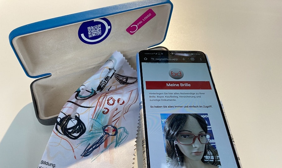 Brix Focus: QR code sticker in the glasses case and thus all data on the mobile phone (Photo: Patricia Perlitschke)